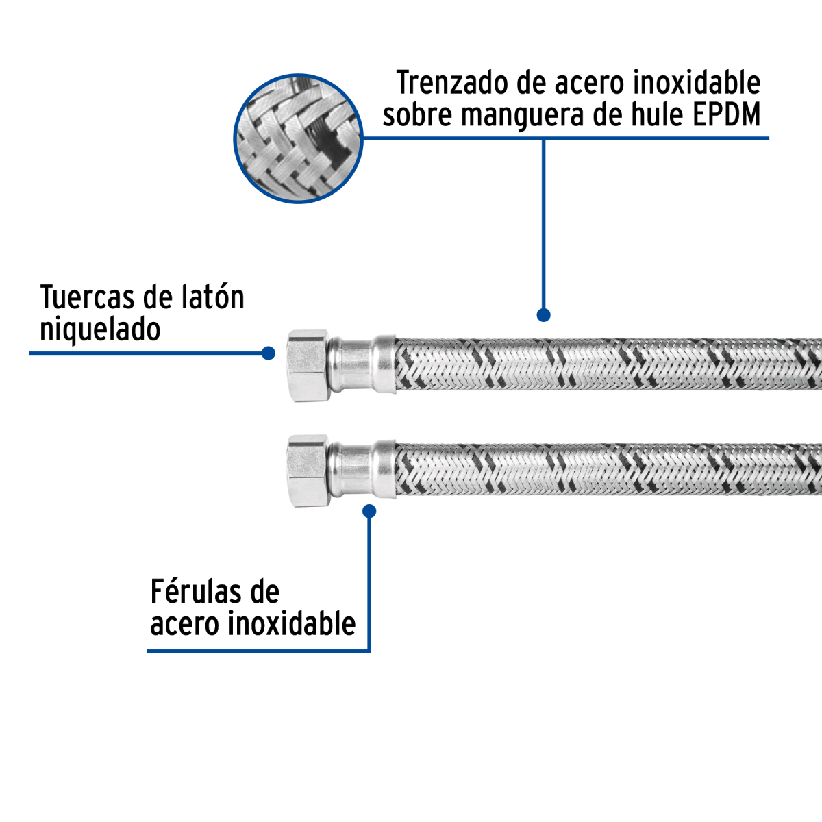- Trenzado de acero inoxidable sobre manguera de hule EPDM para mayor durabilidad y resistencia a la presión