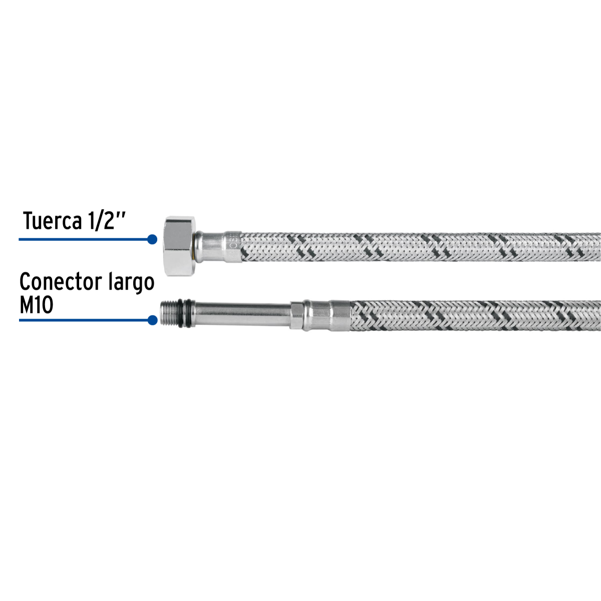- Trenzado de acero inoxidable sobre manguera de hule EPDM para mayor durabilidad y resistencia a la presión